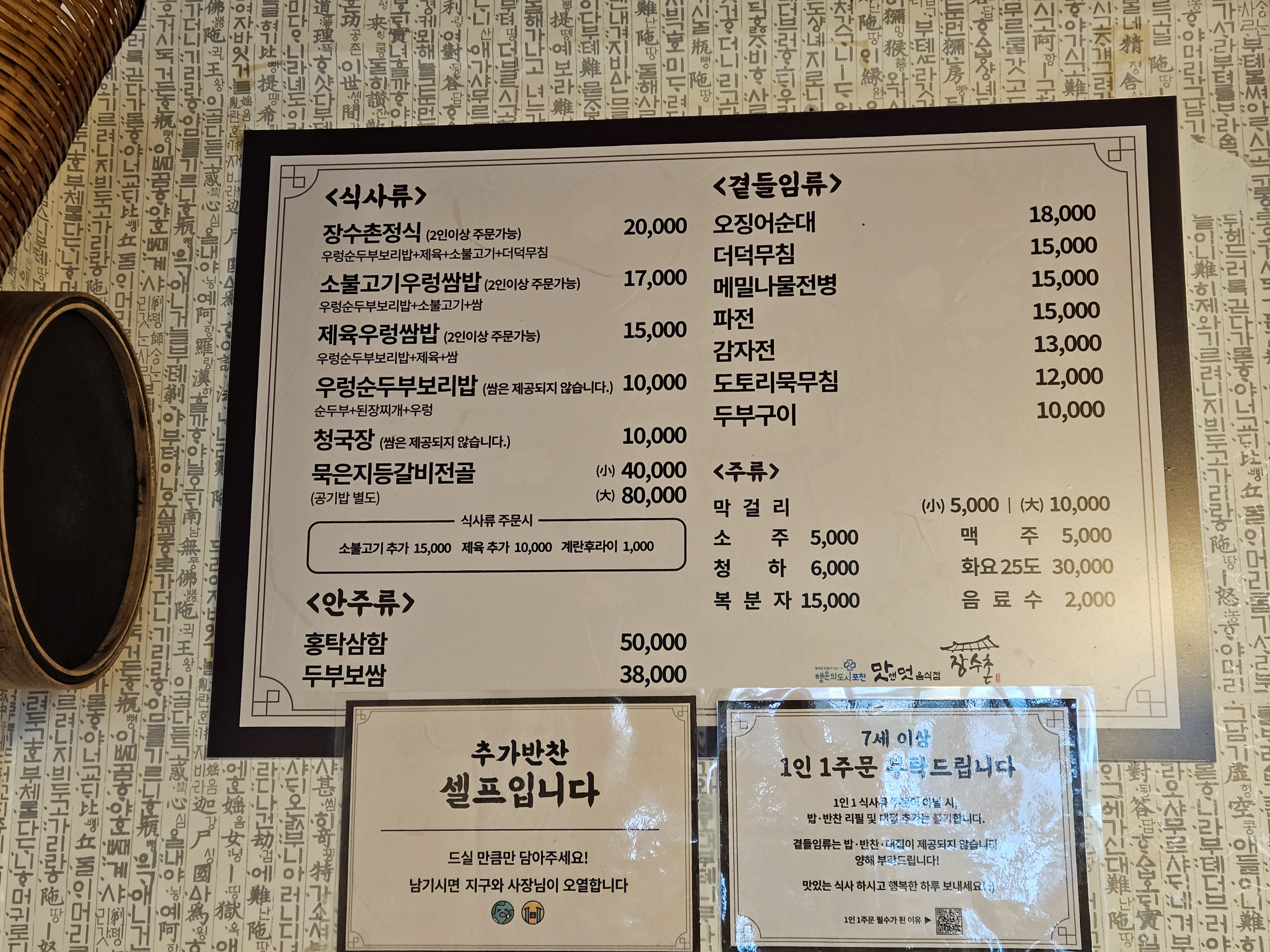 이번에 장수촌정식, 우렁순두부보리밥 각각 2인분씩 시킨건 같이 가신 분 중 2분이 고기를 잘 안드셔서 그렇게 시켜봤습니다